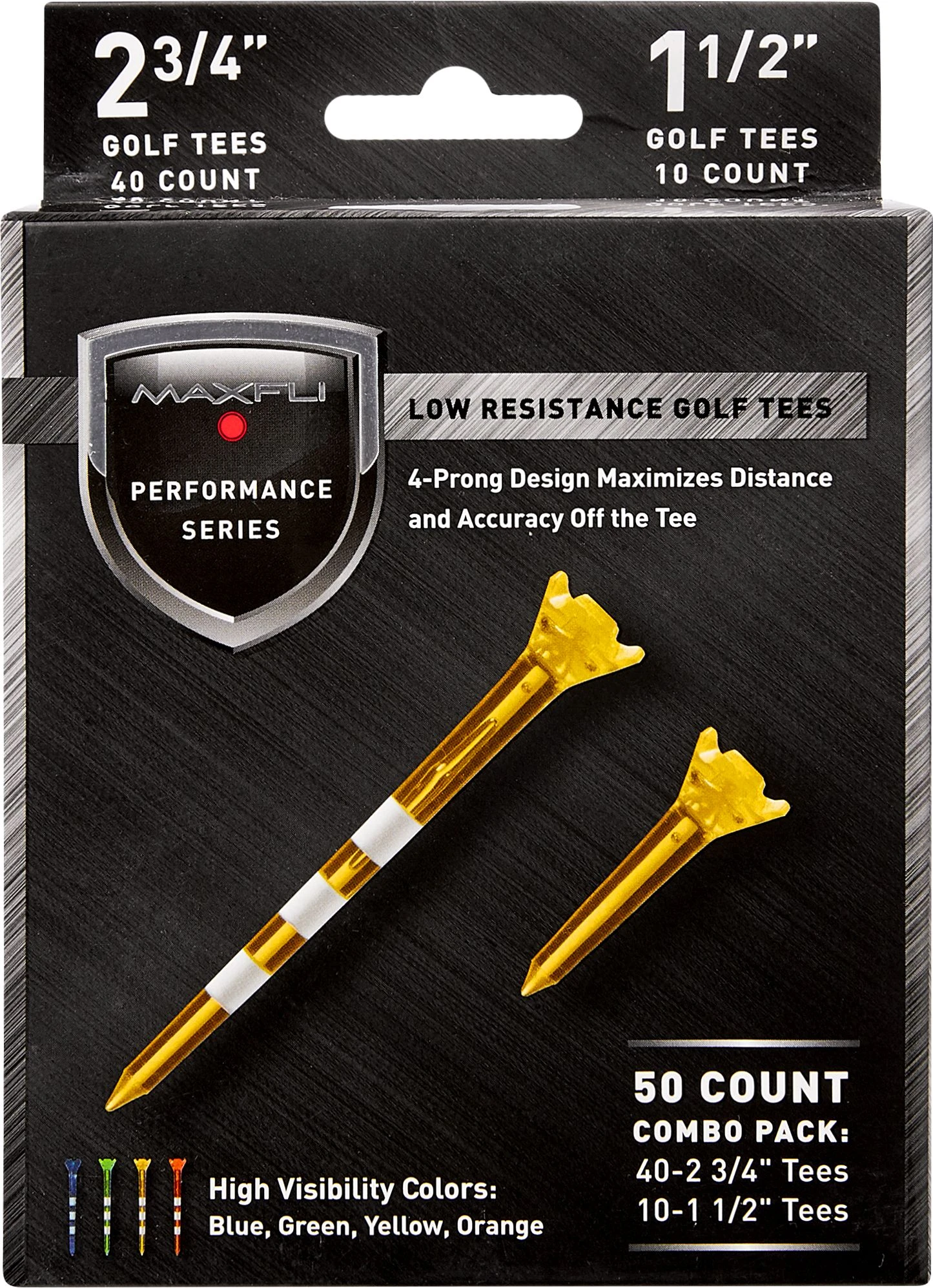 Get a leg up out of the box with Maxfli Performance Series Low Resistance 2 3/4” & 1 1/2” Assorted Golf Tees. 4-prong design minimizes contact between tee and ball, maximizing performance off the tee, while less drag translates to more distance when you need it most. The Optimal Launch System uses 3 bands to promote consistent height and help dial in desired launch, with the bottom band encouraging higher launch and so on.